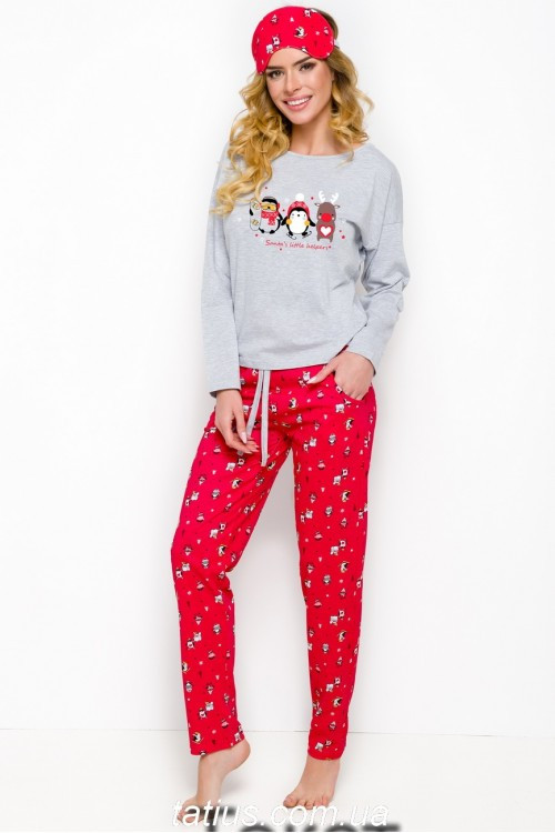 Піжама НоворічнаТаро виготовлена в сучасному, молодіжному стилі. Зкладається з двох елементів: вільна кофта з довгим рукавом та довгі прямі штани. Напівкруглий виріз завершує акуратна тонка вставка. Загалом модель зручна, міцна, не втрачає свою форму після прання.